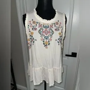 Ivory sleeveless tunic with colorful floral embroidery at the front. Soft, lightweight fabric with a relaxed, flared hem for easy layering. Ruffled neckline and arm openings add a feminine touch. Versatile ivory top that pairs well with jeans or leggings.