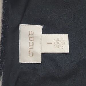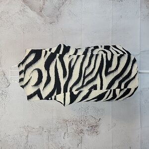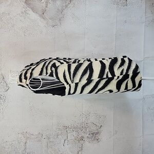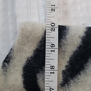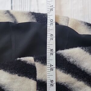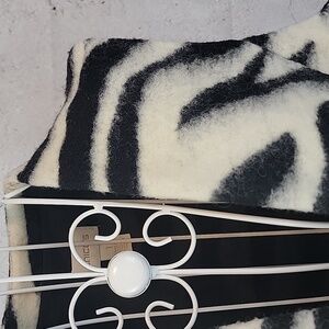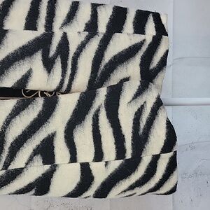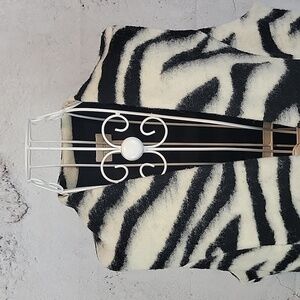 Striking zebra print vest by Chico's in a fuzzy wool blend featuring a long silhouette, a smooth black lining, and a cocoon shaped hemline. Great pre-owned condition.
