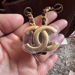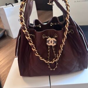 Classic CHANEL shoulder bag in quilted burgundy leather. Gold-tone chain strap and CC logo hardware. Drawstring top with chain detail. Sleek silhouette suitable for day or evening.