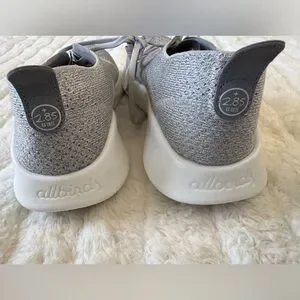 Allbirds breathable knit upper in light gray. Lace-up closure for a secure fit. Low-profile, minimalist silhouette. Cushioned sole for everyday comfort. New but no packaging.