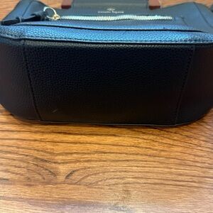 Elevate your accessory game with this chic and versatile Nanette Lepore handbag. Featuring a classic black pebbled vegan leather exterior and unique circular wooden top handles, this bag seamlessly transitions from a sophisticated handheld satchel to a practical crossbody.