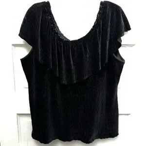 Anthropologie black velvet blouse with a soft pleated texture and dramatic ruffle neckline.