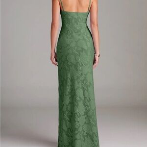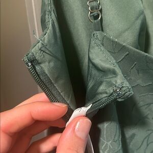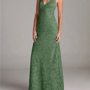 Sophisticated olive green dress with a flattering V-neck silhouette. Features subtle floral jacquard texture for refined detail. Designed for a sleek, elongating fit that moves comfortably. Perfect for formal events and evening occasions. Eucalyptus color, only worn once. Zipper clasp broken, but otherwise perfect condition (would be an easy fix and not entirely necessary to have for wear)