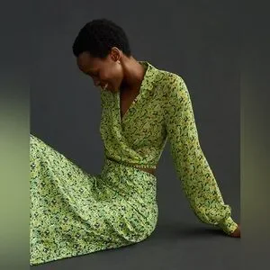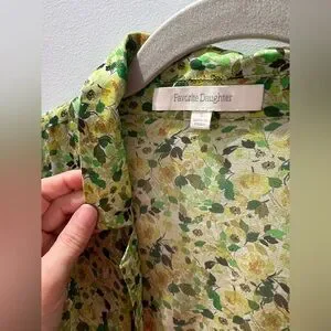 Beautiful Favorite Daughter “The Lover” wrap top in a fresh green floral print. Crafted from lightweight viscose chiffon, this feminine blouse features elegant wrap styling that creates a flattering silhouette and effortless drape.