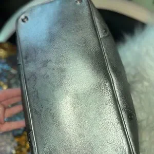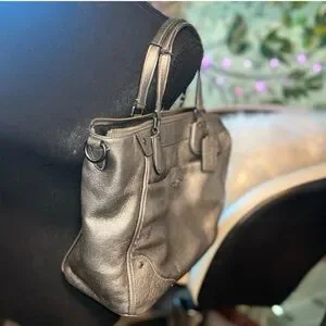 Smooth black leather exterior with subtle logo detail. Dual top handles for hand or arm carry. Structured shape with clean lines. Polished hardware accents.