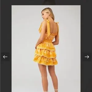 Beautiful Cleobella Eliana Mini Dress in the Coastal print. Features a bright yellow/orange boho floral pattern with tiered ruffle skirt and feminine details. Adjustable tie shoulder straps and a flattering smocked bodice. Lightweight cotton fabric—perfect for summer, vacation, or resort wear.
