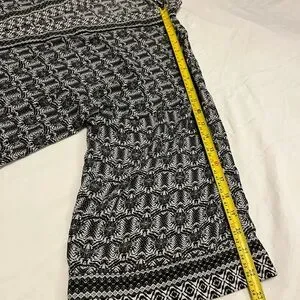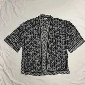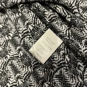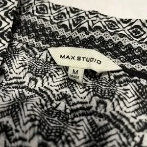 Max Studio Kimono with a bold black and white geometric print. Lightweight fabric with soft drape. Simple neckline and versatile style. Easy to pair with many outfits.