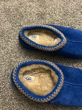 UGG Men's Tasman Slippers in a striking dive blue. These classic clogs feature the signature Tasman braid embroidery around the collar and are fully lined with plush sheepskin/wool shearling for maximum warmth and comfort.