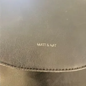 Minimalist black vegan leather backpack. Smooth flap with subtle Matt & Nat logo. Adjustable straps and top handle. Clean lines for everyday carry.