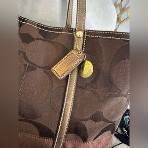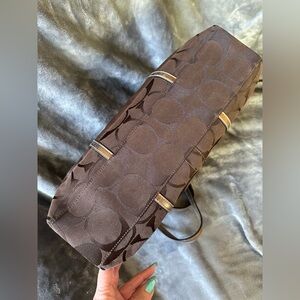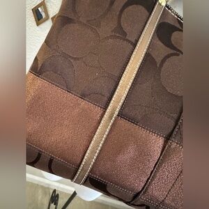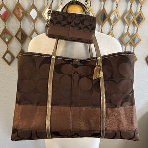 Coach Signature Stripe Tote & matching wristlet characterized by the brand's iconic "C" jacquard pattern and a metallic shimmer stripe.