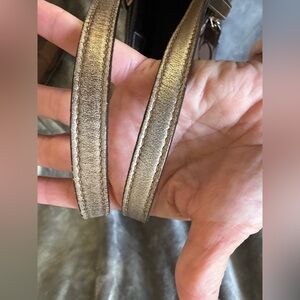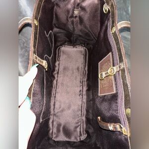 Design: Features a rich chocolate brown canvas with a bronze or copper metallic stripe across the lower section. Trim: Accented with metallic leather straps.