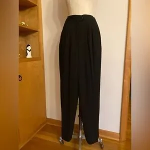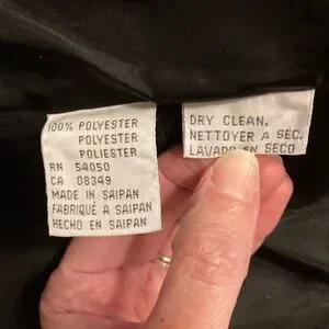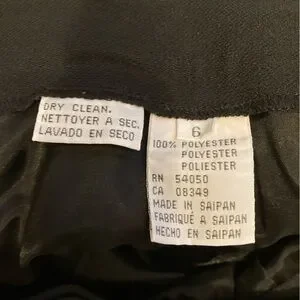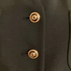 Jones Wear black long-sleeved jacket features a structured, collarless design with a V-neckline and decorative gold-tone buttons. It is part of a coordinated pant suit, often associated with vintage styles.