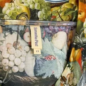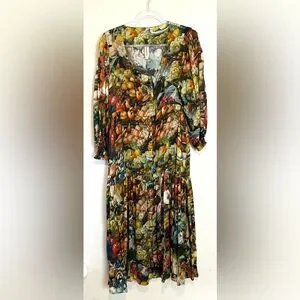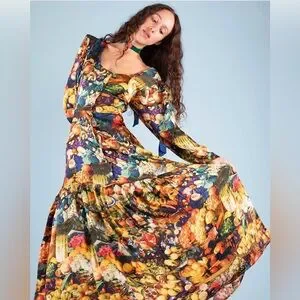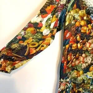 Samantha Pleet banquet dress in harvest print. Made out of their breathtakingly baroque abundance print, this dress features buttons down the front, puff sleeves and a tailored fit that makes it so flattering. You will find a bounty of asparagus, eggplant, apples, grapes and squash in a baroque still life. Gorgeous wearable artwork. Silk and cotton blend. In excellent condition. Size 12.
