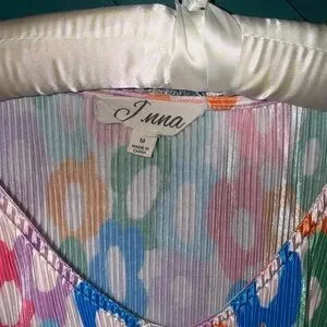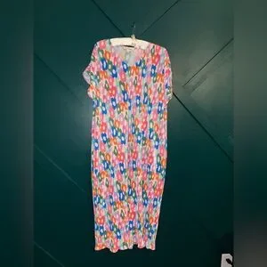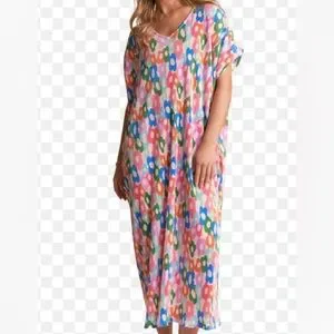 Relaxed maxi dress in a pink multicolor floral print. Lightweight, breathable fabric for all-day comfort. Easy slip-on style with short sleeves and a flattering V-neck. Vibrant pink, blue, green and orange floral pattern adds a cheerful touch.