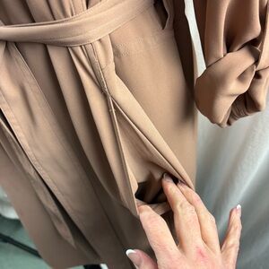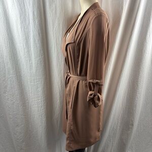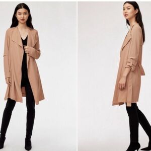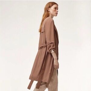 Babaton Quincey Jacket, a modern, lightweight trench from Aritzia. It is characterized by its silky, flowy fabric, draped open front, and belted waist. Size S.