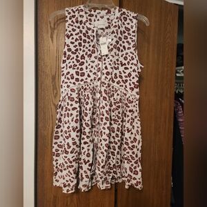 Flowy sleeveless mini dress with leopard print. Soft, breathable fabric for easy all-day comfort. Feminine gathered skirt and delicate trim for a flattering silhouette. Versatile piece that pairs well with jeans or shorts or its own.