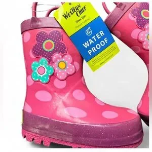 Step into rainy adventures with Western Chief's vibrant pink and purple rain and snow boots. Designed with easy pull-on handles and a durable rubber construction, these boots are perfect for splashing through puddles. Their cheerful design and reliable waterproofing make them a must-have for wet weather.