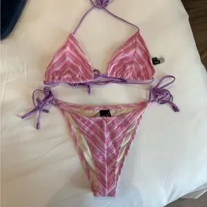 Triangle bikini top with adjustable ties. Matching tie-side bottoms with striped knit texture. Soft stretch fabric with feminine pink and lilac hues.