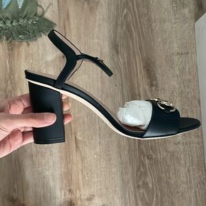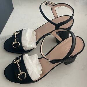 Timeless sophistication meets modern chic in these authentic Gucci block-heel sandals. Crafted in supple black leather, they feature the iconic gold horsebit hardware across the toe strap, an emblem of the house’s heritage. The block heel offers both comfort and style, making them perfect for day-to-night wear.