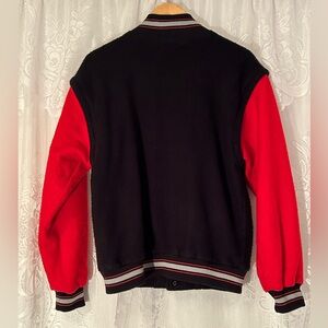 Classic late 80s to early 90s vintage varsity letterman jacket by All Canada featuring a black wool body with bright red sleeves and striped ribbed trim at the collar, cuffs, and hem. The chest has an embroidered All Canada logo in red. Traditional snap front closure and angled welt pockets with red trim give it that classic athletic jacket look. The sleeves zip off, allowing it to be worn as either a full jacket or a vest. Features the classic All Canada maple leaf logo, a patriotic design used on Canadian promotional apparel in the late 1980s and early 1990s. Made in Taiwan and tagged size M. Great sporty vintage piece that works well for casual wear, streetwear styling, or collectors of vintage varsity jackets. Condition: Good vintage condition with normal light wear from age. No major flaws noted. Measurements (approx. laid flat): Chest: 22 in Length: 27 in Please compare measurements with a similar jacket for best fit as vintage sizing can differ from modern sizing.