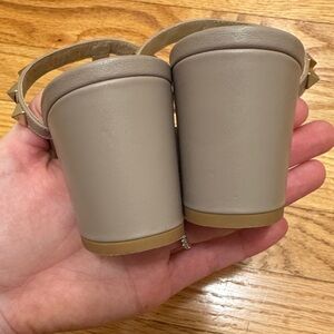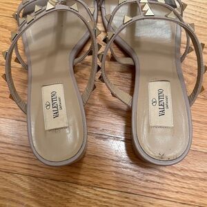 Taupe leather sandal heels with signature pyramid rockstud accents. In good used condition. Please notice minor marks in pictures. Reach out with any questions. Priced well to sell. Comes with dust bag, no box. EU size 38 = US 7.5 / 8