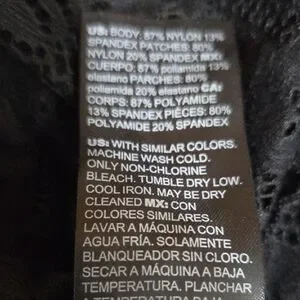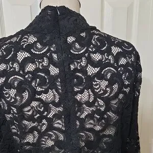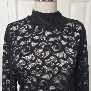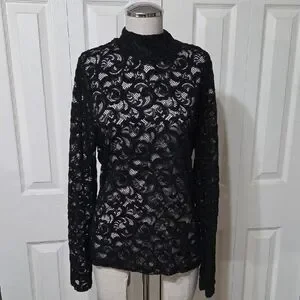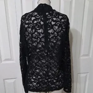 Sheer floral lace long-sleeve top with a mock neckline. Fitted silhouette for layering or worn alone. Delicate scalloped hem and cuffs. Back zipper. Stylish for evening or dress-up looks. Sz. L