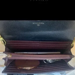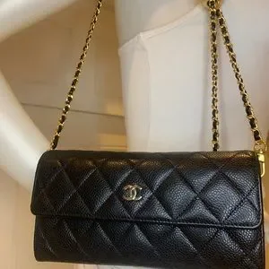 Black Caviar puffed wallet with branded CC on exterior. Non branded Black and gold adjustable chain can be worn multiple ways.