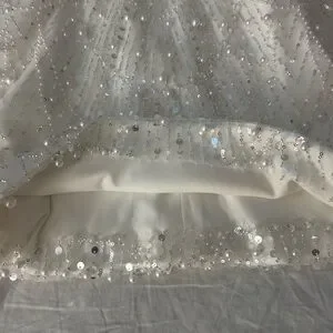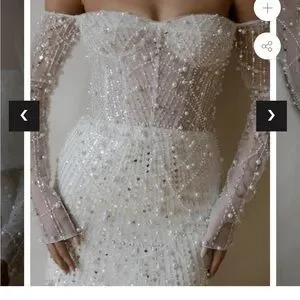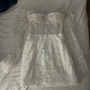 Embellished off-shoulder mini with intricate beadwork. Sheer long sleeves with pearls and crystals. Fitted, ruched silhouette. Glamorous, bridal-ready sparkle.