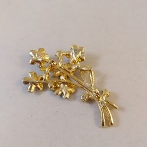 Gold-tone brooch shaped as a small bouquet. Bright blue enamel petals with iridescent rhinestone centers. Delicate gold twisted stems and tiny green enamel leaves. Eye-catching accent for jackets, blouses, and scarves.