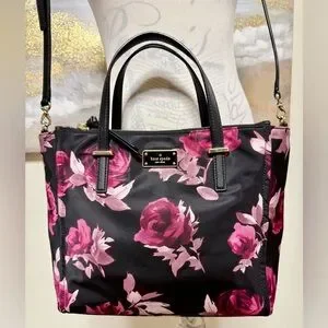 KATE SPADE Crossbody Nylon Tote, P436 Black Pink Roses