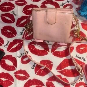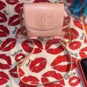 Stylish pink mini bag with iconic CHANEL logo. Features elegant gold chain strap. Perfect for adding a touch of luxury.