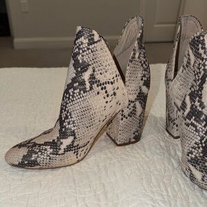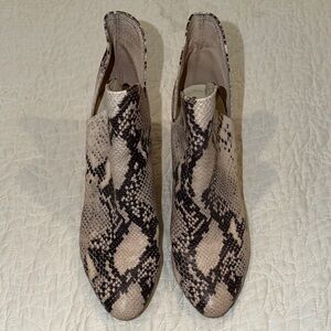 Stylish taupe snake-print ankle boots with a modern cutout silhouette. Soft faux-snakeskin upper in taupe and black adds instant edge. Comfortable block heel for all-day wear. Versatile design pairs with dresses or jeans.