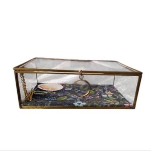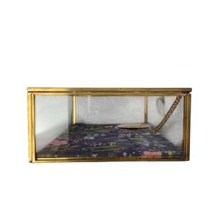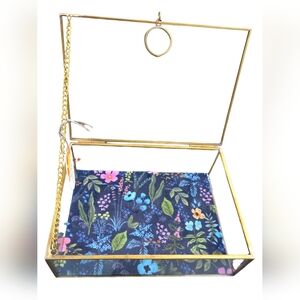 Elegant glass jewelry box with a gold frame. Features a vibrant floral design inside. Frame will patina through time.
