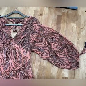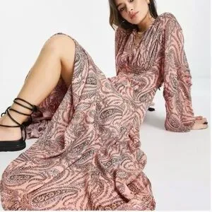 Elegant pink paisley maxi dress with long sleeves and a flowing skirt. Lightweight, soft fabric that drapes beautifully. Versatile design perfect for daytime events or evening outings. Features a flattering V-neck and feminine silhouette.