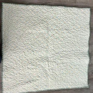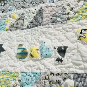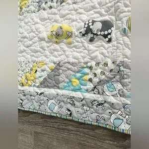 Soft patchwork baby quilt with playful animal and geometric prints. Colors include yellow, aqua, gray and white. Machine quilted texture. Cozy and charming nursery accent.