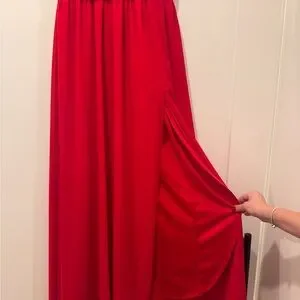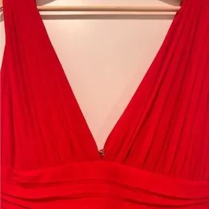 Chic red maxi dress with a deep V-neckline. Perfect for elegant occasions.