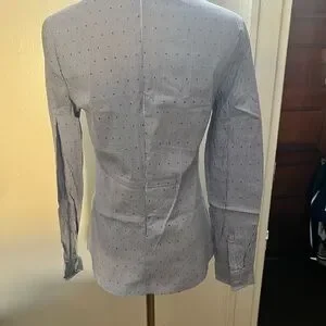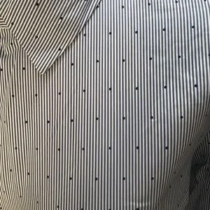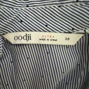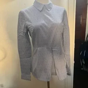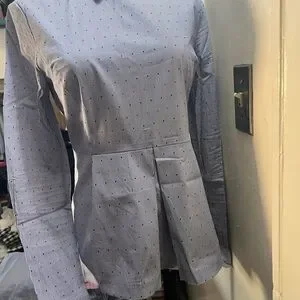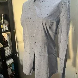 Shirt purchased in Europe, never worn. Chic and polished oodji Ultra striped blouse featuring a flattering peplum waist silhouette that creates a beautifully tailored shape. The classic blue and white pinstripe pattern with subtle dotted accents gives this top a sophisticated yet modern look.