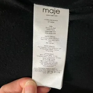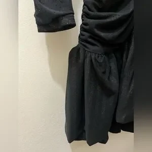 Black long-sleeved minidress with gold stripes by Maje, French size 1 (US small). Some allover wear but good used condition and freshly cleaned. Front zipper. V-neck. Dropped waist and bubble skirt. Please, NO RETURNS. Questions/offers welcome!
