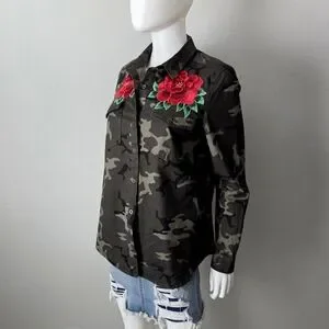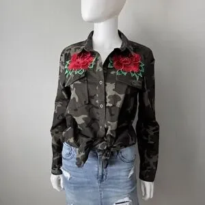 Love Tree Camo Long Sleeve Button Down W/ Red Roses & Pockets, Size Small