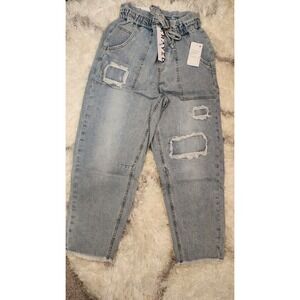 FRAYED Women's Super Rise Crop Utility Jeans Distressed Frayed Hem Tie Waist