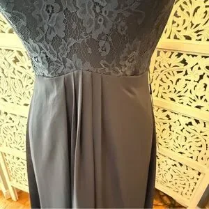 A navy maxi dress featuring a delicate lace bodice and scoop neckline for elegant appeal. Sleeveless design with a flowing skirt creates a graceful silhouette. Perfect navy color for formal events and evening occasions.