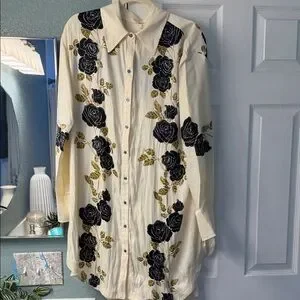 Free People Cream Button-Up Shirt with Black and Gold Rose Print