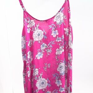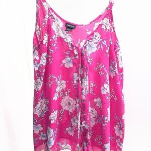 Vibrant hot pink floral camisole with adjustable straps. Front lace-up detail adds a flirty touch. Flowing silhouette for an easy, feminine look. Pairs well with jeans or skirts.