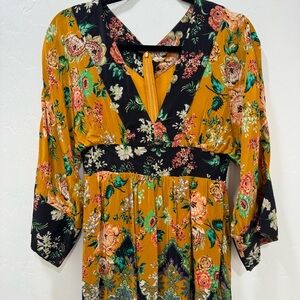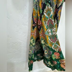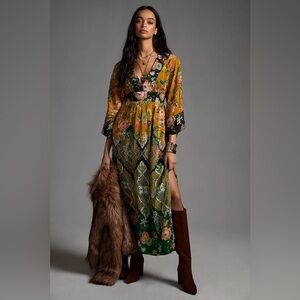 Beautiful Anthropologie bohemian maxi dress featuring a rich patchwork floral and paisley print in warm mustard, green, and earthy tones. The flattering empire waist and flowing silhouette create an effortlessly feminine look, while the kimono-style sleeves add a relaxed boho vibe.