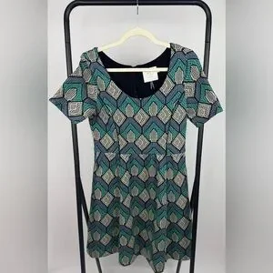Anthropologie HD in Paris Hollyhock dress featuring a textured geometric “pixel” print in shades of blue, teal, cream, and black. This structured fit-and-flare A-line silhouette has a flattering scoop neckline, short sleeves, and a back zipper closure.