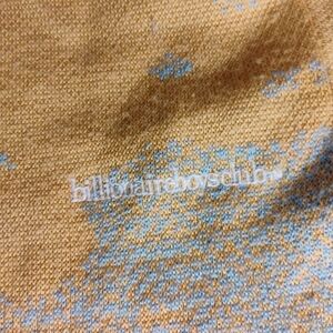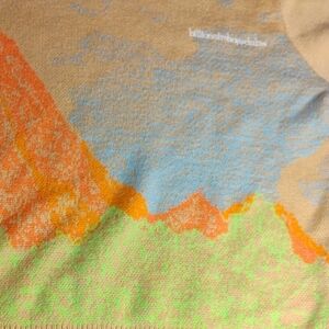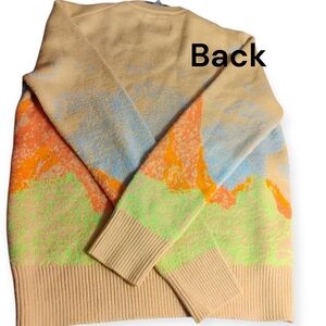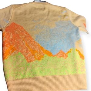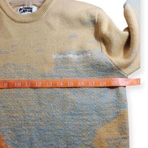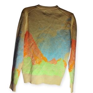 Billionaire Boys Club men's sweater, size Small, featuring a vibrant landscape-inspired graphic knit. Made from a comfortable 60% acrylic / 40% wool blend. Multicolor graphic on a tan base.