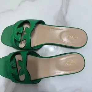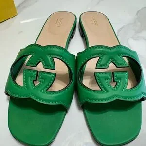 Elegant green slides with iconic Gucci logo. Perfect for casual elegance.