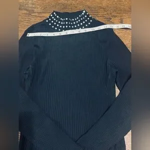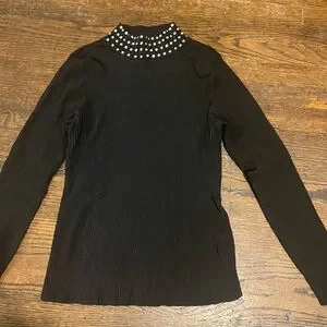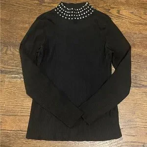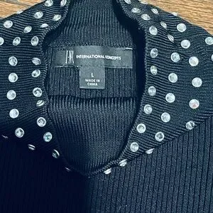 INC International Concepts Black Ribbed Sweater with Rhinestone Collar