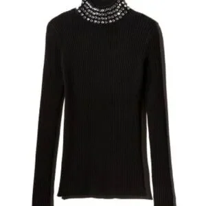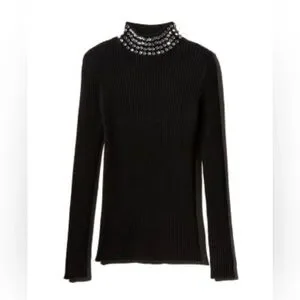 Ribbed knit sweater featuring a jewel-studded collar. Long sleeves and a streamlined silhouette. Sparkling rhinestones add dressy detail. Easy to style for evening or casual wear.