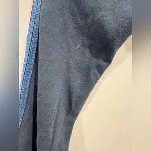 Navy joggers with contrasting yellow and orange side stripes. Elastic waistband and cuffed ankles. Small embroidered square logo near pocket. Comfortable, casual style for everyday wear.